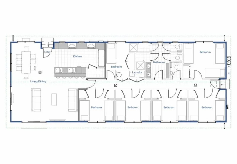 A convenient accommodation solution designed to house seasonal workers, backpackers, and students. Suitable for up to twelve residents, it's complete with a large communal kitchen, spacious common area, and ample washing facilities.